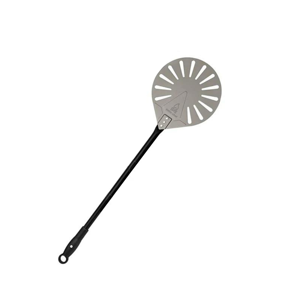 12 Inch launching peel: This 12 inch Pizza Paddle allows for easy removal of a standard 12 inch pizza thanks to its hard anodised, non stick surface. The perforated pizza spatula head encourages pizza to slide off the peel with minimal stickiness, while excess flour is released to avoid burning in the oven. The lightweight and professionally balanced handle features a silicon grip for enhanced control and a tapered edge for simple insertion beneath the pizza base.
