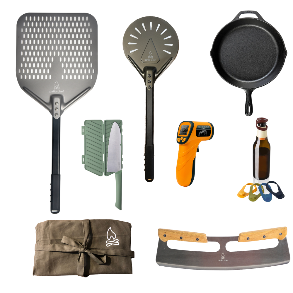 The Patio Pro Pizza Oven Pack is ideal for use with wood-fired or gas outdoor ovens. It equips users with the necessary gear to make culinary masterpieces, from baking a pizza to grilling a steak. The 10.25-inch Cast Iron skillet is perfect for cooking, while the IR Temp Gun and Chef Apron keep temperatures at a desirable level and clothes spotless. Plus, the pizza peels allow you to remove your pizza from the fire with ease. Equipping yourself with the right tools enables you to craft delicious meals quickly and with confidence. Also included: a Kai Manasaya Santoku knife, complete with a transportable sheath. This high-quality piece from Shun brand knives is durable, and versatile enough to double as a heat-resistant mat (up to 90°C).